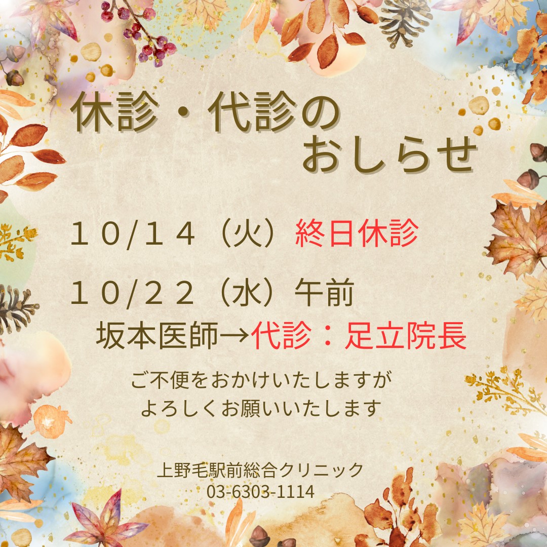 10月22日(水) AM坂本医師 休診 →代診 足立院長